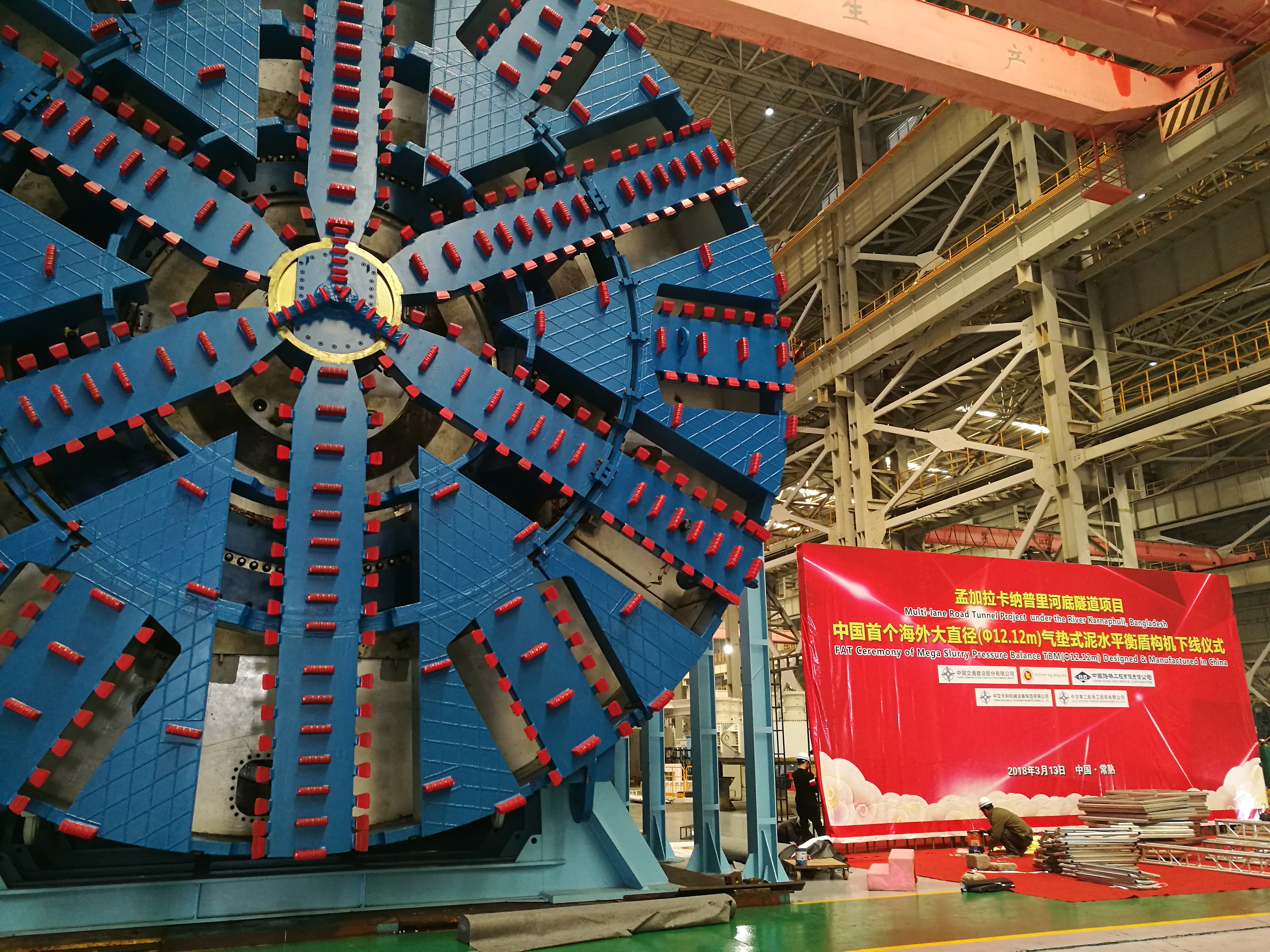 3月13日,由中交天和自主研制的中國(guó)出口海外大直徑盾構(gòu)機(jī)在江蘇常熟成功下線,盾構(gòu)機(jī)刀盤直徑達(dá)12.12米、長(zhǎng)94米、重2200余噸,是南亞地區(qū)大直徑的盾構(gòu)機(jī)。該盾構(gòu)機(jī)將用于中國(guó)在海外大的盾構(gòu)公路隧道項(xiàng)目--孟加拉卡納普里河底隧道工程,打破了由發(fā)達(dá)國(guó)家對(duì)海外超大直徑盾構(gòu)市場(chǎng)的壟斷,標(biāo)志著中國(guó)盾構(gòu)機(jī)設(shè)計(jì)研發(fā)能力達(dá)到了領(lǐng)先水平。