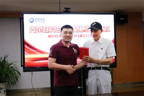 在熱烈的掌聲中,黨委書記楊凌杰為“光榮在黨50年”老同志鄭征途頒發(fā)紀念勛章,老同志激動萬分,感恩黨和國家,永遠聽黨話,跟黨走。