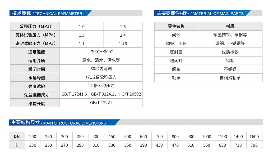 蝶形緩閉止回閥主要用于凈水、原水、污水、海水等介質(zhì)的供、排水管道上,安裝在水泵出口處,用以截?cái)嘟橘|(zhì)的回流,消除水錘,保護(hù)管道、水泵的安全運(yùn)行。其主要特點(diǎn):體形小、重量輕、結(jié)構(gòu)長度只有旋啟式止回閥的三分之一左右。帶外置阻尼油缸,緩閉性能優(yōu)良,不受管道中介質(zhì)的影響,閥瓣先速關(guān)后緩閉,可防止破環(huán)性水錘。橡膠軟密封,結(jié)構(gòu)密封性能好,耐磨損,使用壽命長。橡膠緩沖,運(yùn)行平穩(wěn),無震動(dòng)及噪音,比老式止回閥流阻小,有明顯的節(jié)能效果。